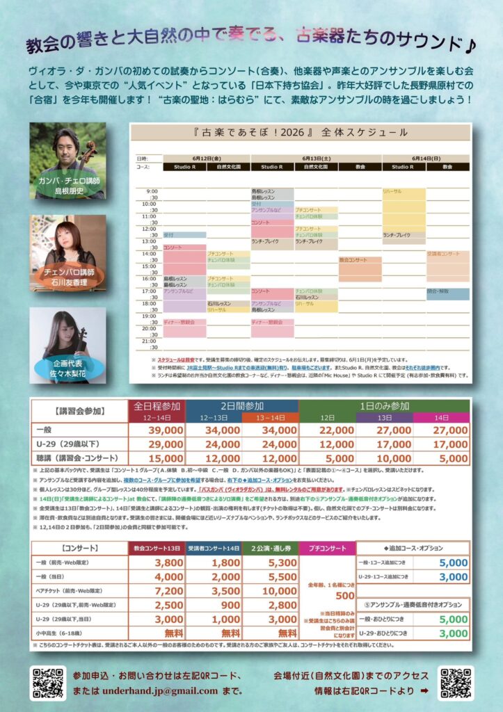 【第二弾!】2026年6月12日(金)〜14日(日)、ガンバコンソートをはじめ、チェロ、チェンバロの個人レッスン、そして教会コンサートに受講生コンサートと内容盛りだくさん